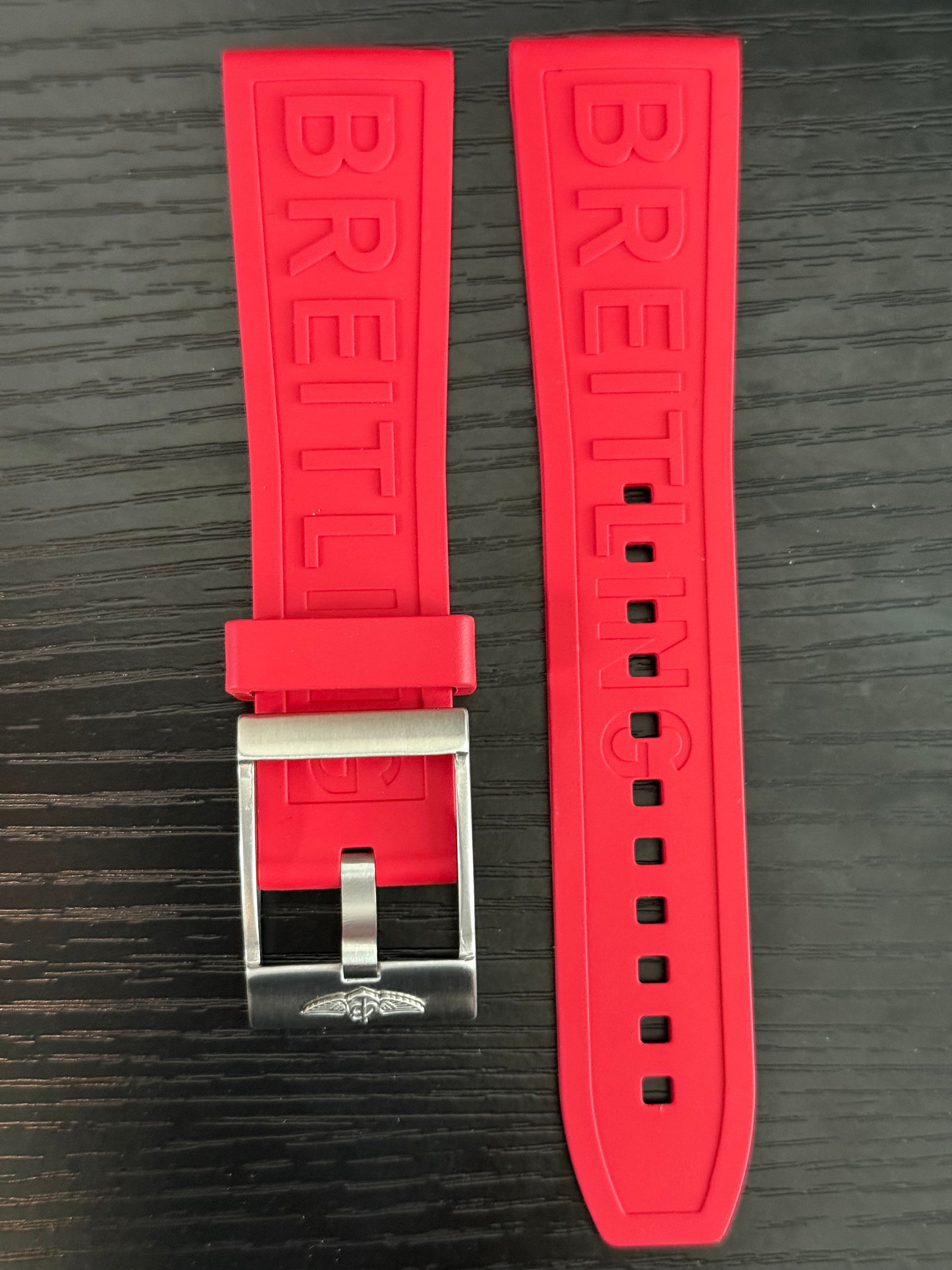 New Breitling OEM 24MM Diver Pro Red Rubber Strap w/ OEM Tang Buckle. Buy now for 25%+ off boutique prices. Strap measures 24MM at the lugs and 20MM at the buckle. Length is 125/85MM long. 24MM straps fit larger 45+MM Breitling Case Watches. Please measure and confirm or reach out to us for support.