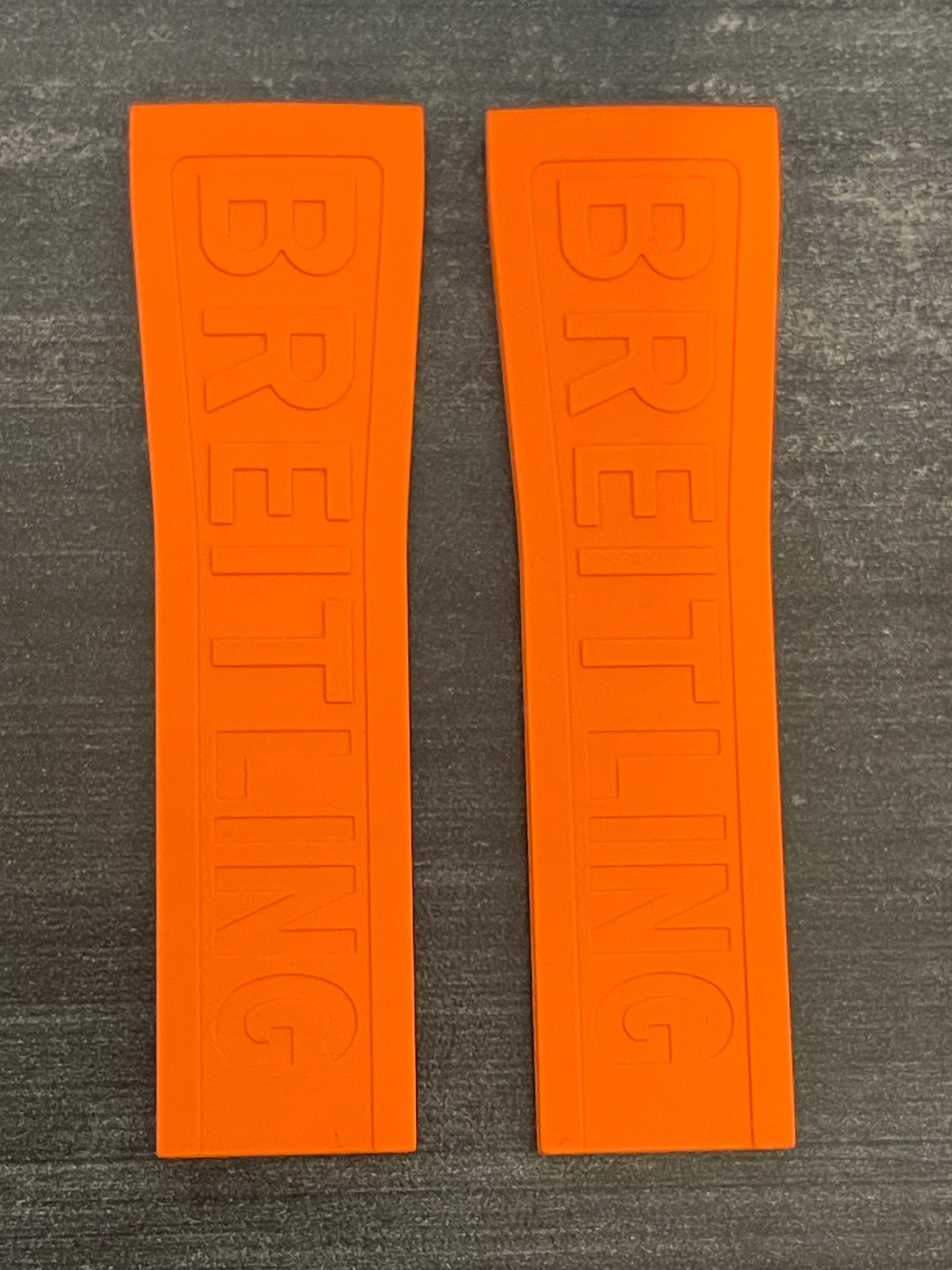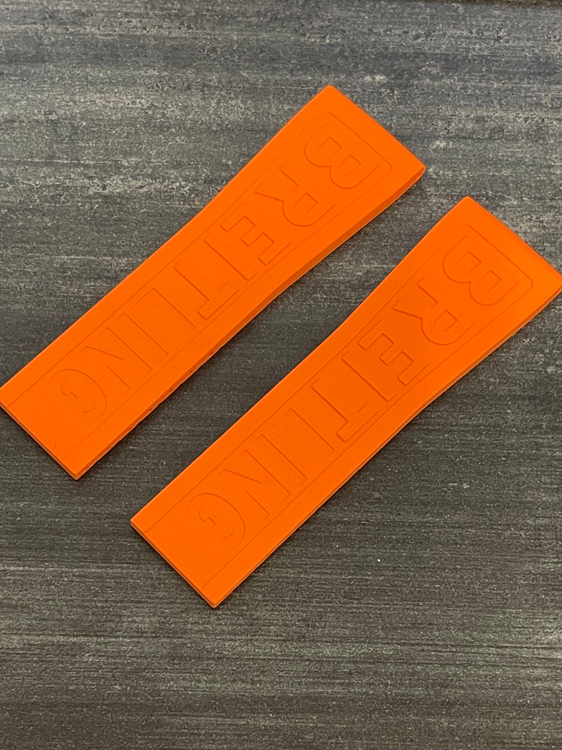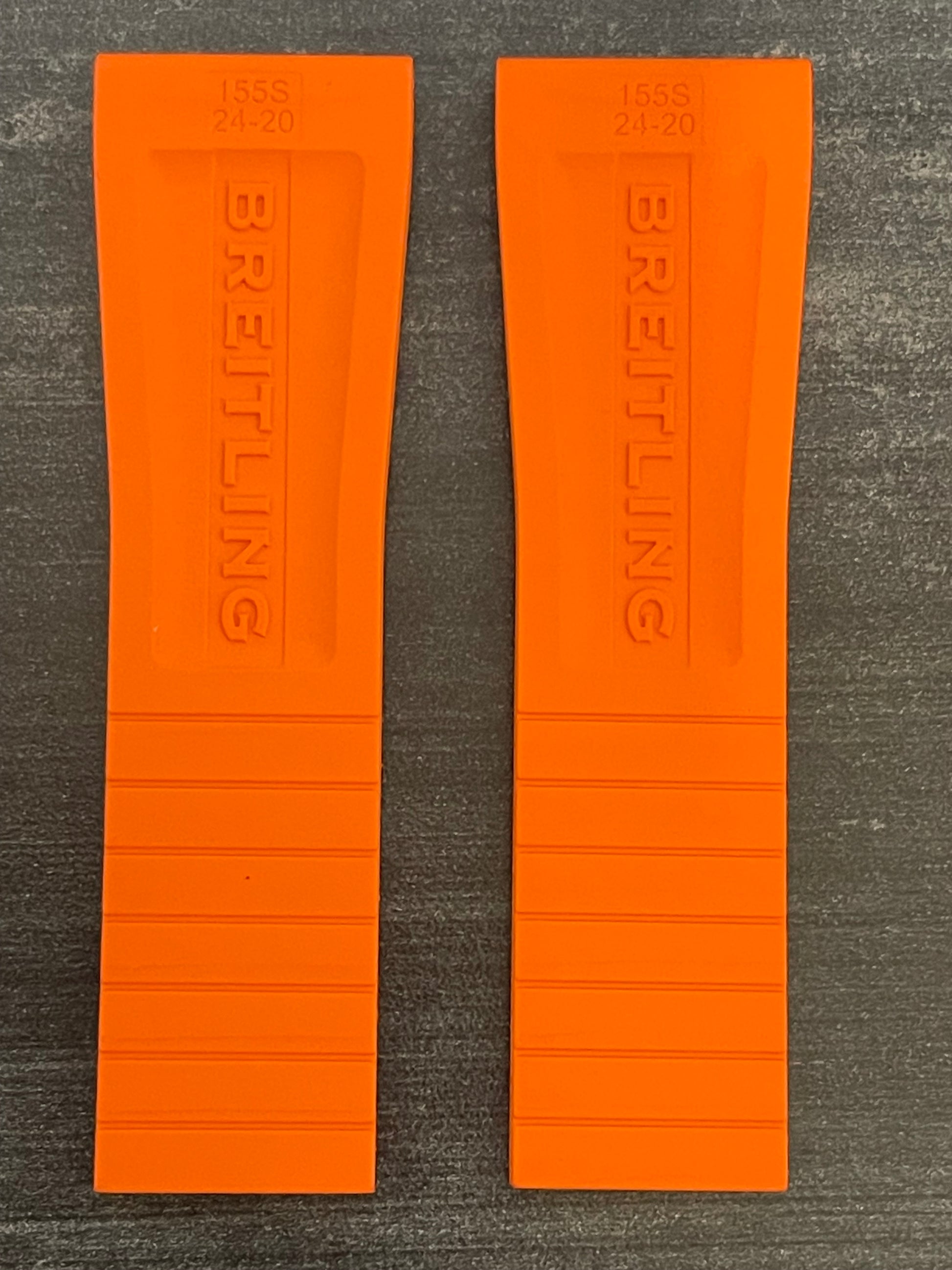 Enhance the style of your Breitling watch with this 24-20MM orange deployant Diver Pro III model rubber strap. The two-piece strap has a band width of 24mm and is compatible with 20MM Breitling deployant clasps (if require I have for sale in steel and PVD or DLC). The color and theme of this wristwatch band perfectly complements the diver style of the watch.